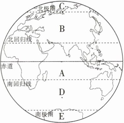 1. A. 热带 B. 北温带 C. 北寒带 D. 南温带 E. 南寒带 2. $23^{\circ}26^{\prime}N$ 南极圈 3. A 4. CD