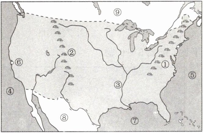3. ③是____河,④是____洋,⑤是____洋,⑦是____湾。