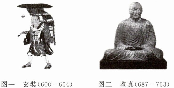 图二鉴真:唐朝与日本的交往中最富影响力的僧人,唐玄宗时期,鉴真东渡日本传授佛法,为日本设计唐招提寺等,为中日文化交流作出了卓越贡献。
