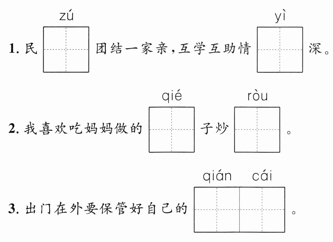 1. 族 谊 2. 茄 肉 3. 钱财