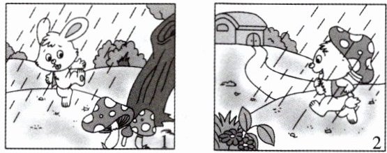 有一天,小白兔在外面玩耍,突然下起了大雨。它没带伞,正着急时,看到大树下有大蘑菇。它灵机一动,摘下大蘑菇,把它举在头顶当作伞,开心地跑回了家。