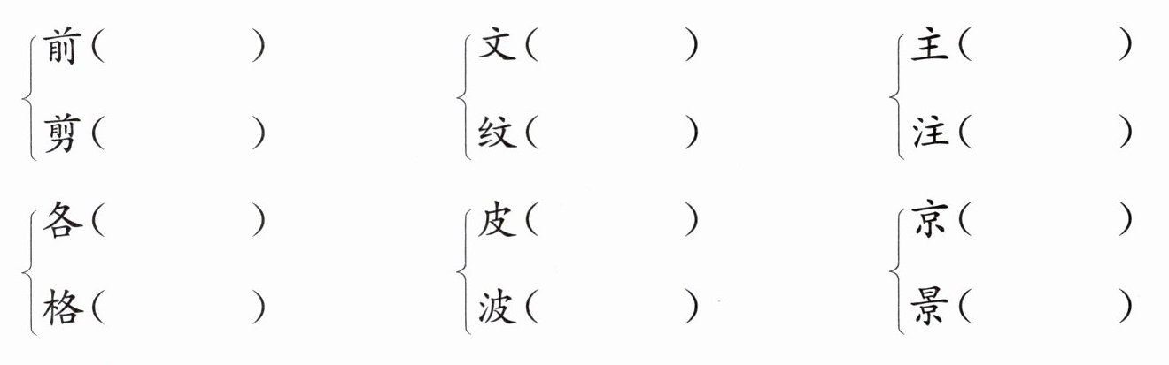 示例:$\left\{\begin{array}{l}\text{前面}\\ \text{剪刀}\end{array}\right.$ $\left\{\begin{array}{l}\text{文学}\\ \text{纹路}\end{array}\right.$ $\left\{\begin{array}{l}\text{主人}\\ \text{注音}\end{array}\right.$