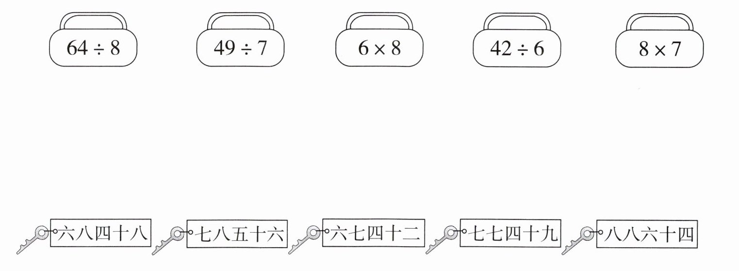 【解析】:根据乘法口诀来进行连线。“$64÷8$”,想“八八六十四”;“$49÷7$”,想“七七四十九”;“$6×8$”,想“六八四十八”;“$42÷6$”,想“六七四十二”;“$8×7$”,想“七八五十六”。