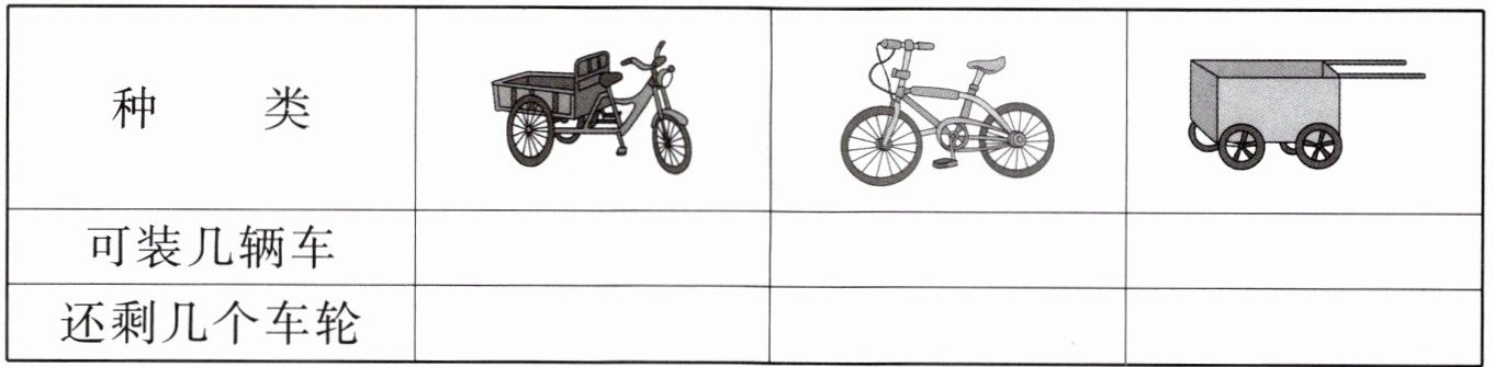 四、有 15 个车轮,分别可以装几辆车?还剩几个车轮?填一填。