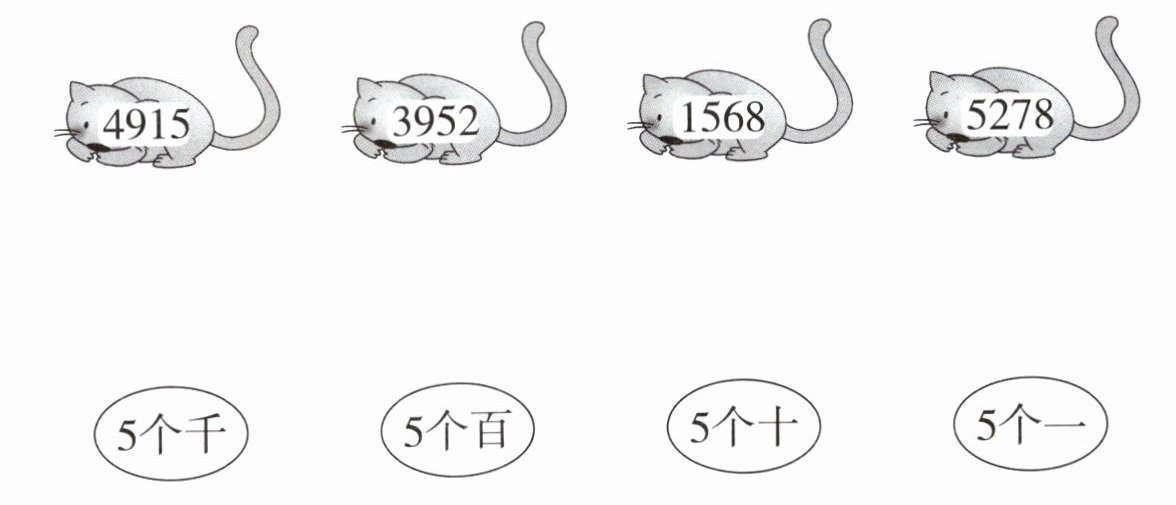 【解析】:4915中的“5”在个位,表示5个一;3952中的“5”在十位,表示5个十;1568中的“5”在百位,表示5个百;5278中的“5”在千位,表示5个千。
