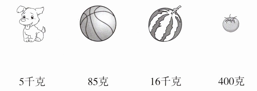 【答案】:小狗——5千克;篮球——85克;西瓜——16千克;西红柿——400克。
