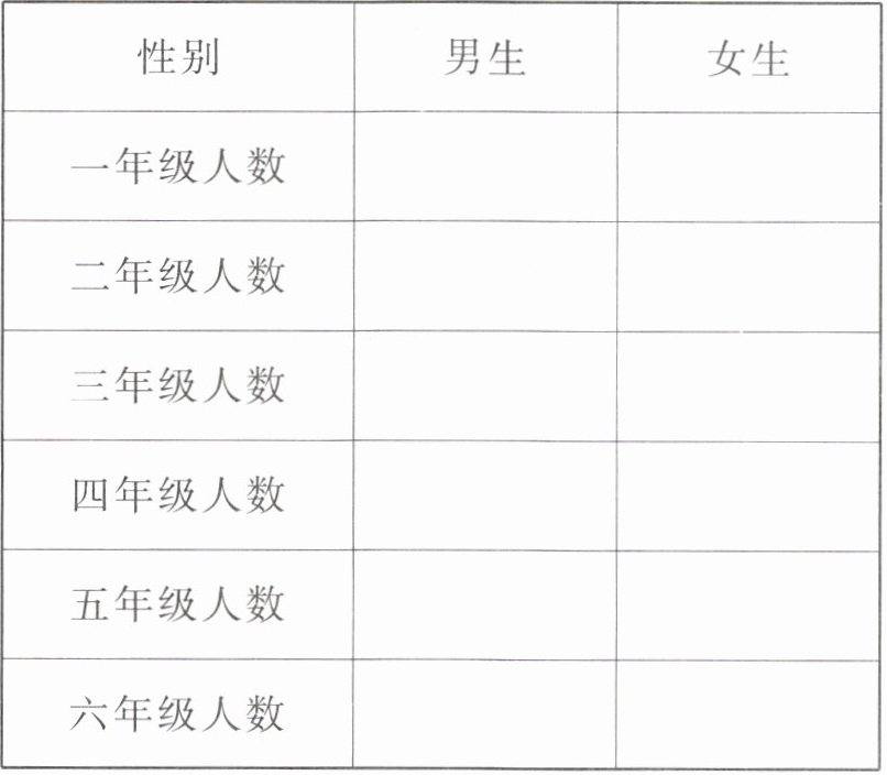 2. 小组同学分工合作,了解本校各年级男、女生人数,并把下面的统计表填写完整。