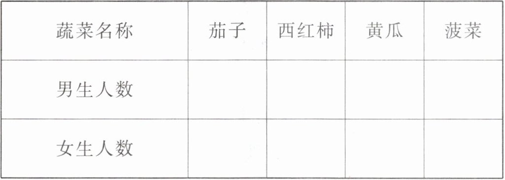 【解析】:这需要实际在班级中进行调查统计,比如可以通过举手投票等方式,分别统计出喜欢茄子、西红柿、黄瓜、菠菜的男生人数和女生人数。