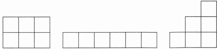 2. 用 6 个面积是 1 平方米的正方形拼成下面的图形,它们的面积各是多少? 它们的周长呢?