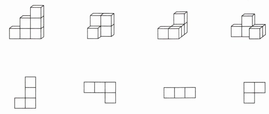 【解析】:观察物体从上面看的形状,第一个物体从上面看是三个并排的正方形,对应第三幅小图;第二个物体从上面看是类似“L”形(两层,上层两个,下层一个靠右),对应第四幅小图;第三个物体从上面看是四个正方形(前面三个并排,后面一个在最右边),对应第二幅小图;第四个物体从上面看是类似“T”形(下面三个并排,上面一个在中间),对应第一幅小图。