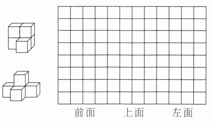 五、动手画一画。(在方格纸上分别画出下图物体从前面、上面和左面看到的图形)