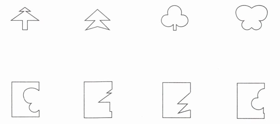 【解析】:通过观察图形的形状特征,第一个图形有三个尖角,与第二张纸的形状匹配;第二个图形有两个尖角,与第三张纸的形状匹配;第三个图形是曲线形状,与第一张纸的形状匹配;第四个图形也是曲线形状,与第四张纸的形状匹配。