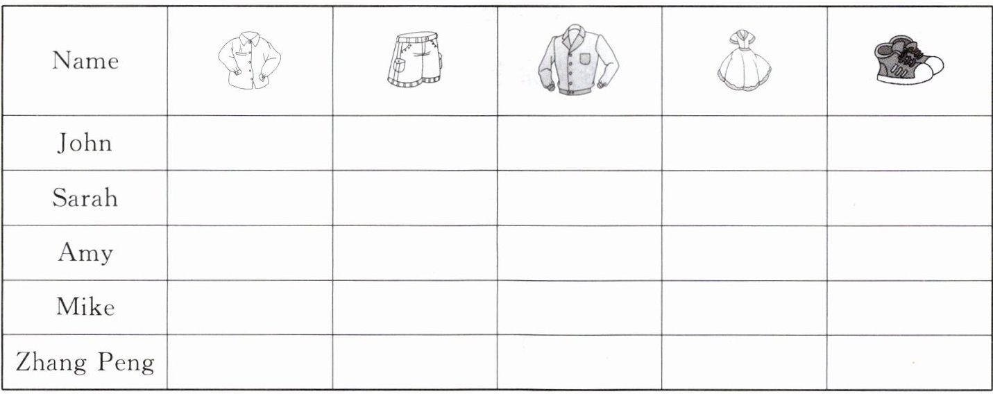 Look! This is Mike's pink shirt. That is Amy's red dress. It's pretty. John's shoes are yellow and green. Those are Sarah's shorts. This is Zhang Peng's jacket.