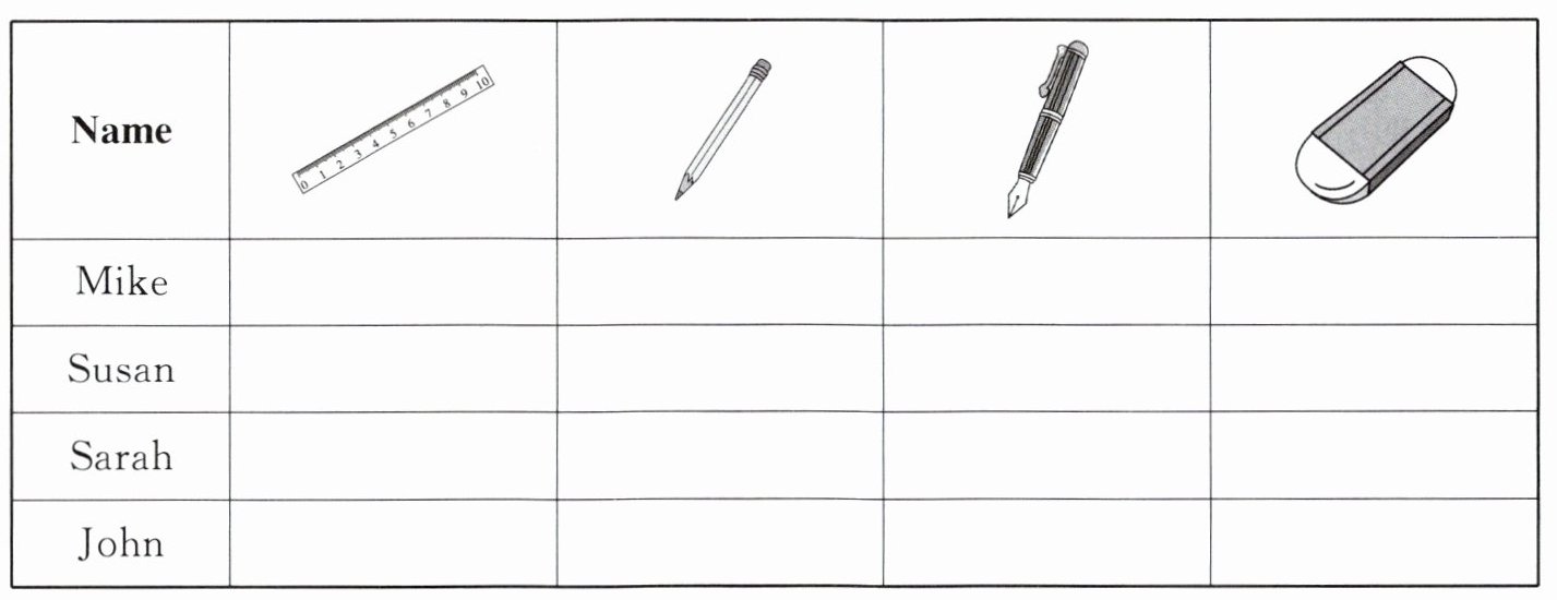 六、读一读,完成表格内容,看看他们都有哪些文具,在相应的物品下打“√”