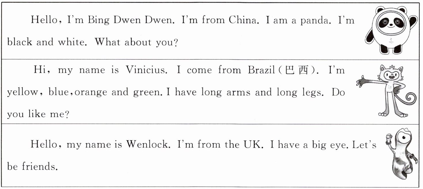 六、阅读奥运会吉祥物的自我介绍,判断句子正(T)误(F)