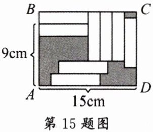 53 【解析】设小长方形宽为$xcm$,长为$ycm$,则有$BC = 4x + y = 15$,$CD = 2x + y$,$AB = 9 + x$,因为$AB = CD$,所以$2x + y = 9 + x$,即$x + y = 9$,$\left\{\begin{array}{l} 4x + y = 15,\\ x + y = 9,\end{array}\right.$解得$\left\{\begin{array}{l} x = 2,\\ y = 7,\end{array}\right.$故小长方形的长和宽分别是$7cm$和$2cm$。因为长方形$ABCD$面积为$15×11 = 165(cm^{2})$,每个小长方形的面积为$2×7 = 14(cm^{2})$,故$S_{阴影}=S_{大长方形ABCD}-8×S_{小长方形}=165 - 8×14 = 53(cm^{2})$。
