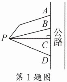 1. 如图,小明为了尽快从点 $ P $ 走到公路,选择沿路径 $ PC $ 行走,其中蕴藏的数学知识是 ………………………………………………………………………(
