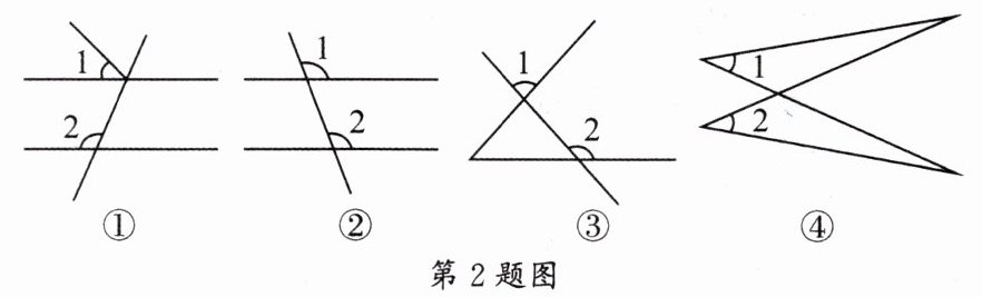 2. 如图,$ ∠1 $ 与 $ ∠2 $ 是同位角的有 …………………………………………………(