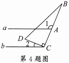 4. 如图,直线 $ a // b $,直角三角形如图放置,$ ∠DCB = 90^{\circ} $,若 $ ∠1 = 118^{\circ} $,则 $ ∠2 $ 的度数为 ………………………………………………………………………(