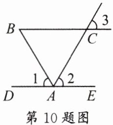 10. 如图,已知直线 $ DE $ 经过点 $ A $ 且 $ ∠1 = ∠B $,$ ∠2 = 60^{\circ} $,则 $ ∠3 = $