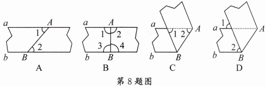 8. 以下四种沿 $ AB $ 折叠的方法中,由相应条件不一定能判定纸带两条边线 $ a $,$ b $ 互相平行的是 ………………………………………………………………………(