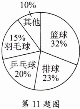 11. 小明对七(1)班全班同学“你最喜欢的球类项目是什么(只选一项)?”的问题进行了调查,把所得数据绘制成如图所示的扇形统计图,由图可知,“乒乓球”对应的扇形的圆心角度数是
