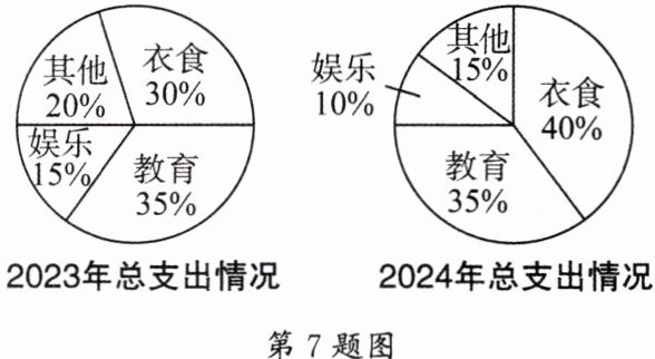 7. 如图是小明家 2023 年和 2024 年的家庭支出,已知 2023 年的总支出为 5 万元,2024 年的总支出为 4 万元,根据统计图,小明家这两年支出中最多的项目是………………………………………… (
