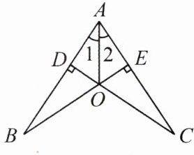 )。所以$OD= OE$(全等三角形对应边相等)。在$\triangle BDO和\triangle CEO$中,因为$\left\{\begin{array}{l} ∠BDO= ∠CEO(垂直的定义),\\ OD= OE(已证),\\ ∠DOB= ∠EOC(对顶角相等),\end{array}\right. $所以$\triangle BDO\cong \triangle CEO$(ASA