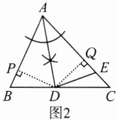 (2)如图2,过点D作DP⊥AB,垂足为P,作DQ⊥AC,垂足为Q,因为AD是△ABC的角平分线,所以DP= DQ。因为$S_{△ABD}= \frac {1}{2}AB\cdot DP= 16$,AB= 8,所以DP= DQ= 4,所以$S_{△CDE}= \frac {1}{2}CE\cdot DQ= \frac {1}{2}(AC-AE)\cdot DQ= \frac {1}{2}×(10-8)×4= 4$。