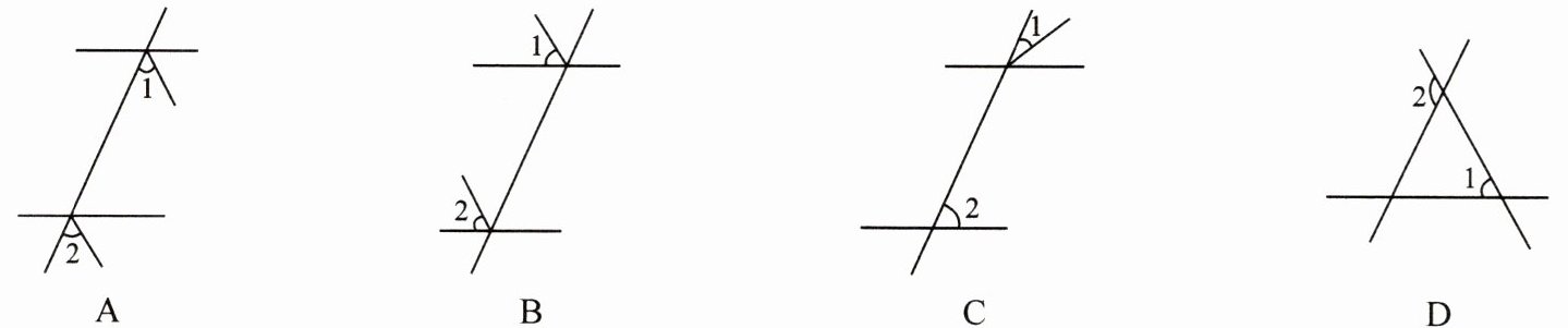 1.下列四个图形中,$∠1$和$∠2$不是同位角的是(