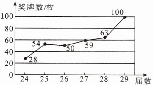 10. 如图是我国体育健儿在六届奥运会上获得奖牌的情况,其中奖牌数超过 50 枚的有