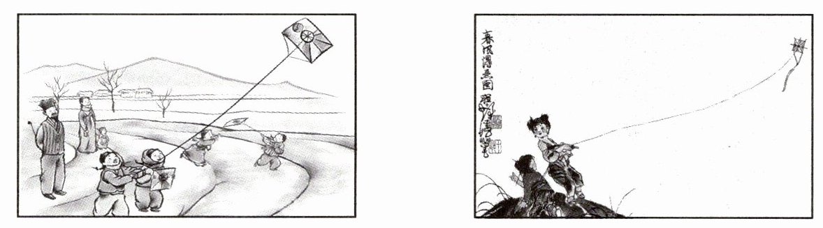 材料三 “草长莺飞二月天,拂堤杨柳醉春烟。儿童散学归来早,忙趁东风放纸鸢。”现在有很多表现古代儿童放风筝的画作,下面是其中两幅。
