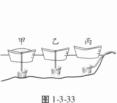 1. (2024·河南中考)宋朝的怀丙利用浮船打捞铁牛,展现了我国古人的智慧。如图1-3-33为打捞过程示意图,先将陷在河底的铁牛和装满泥沙的船用绳索系在一起,再把船上的泥沙铲走,铁牛就被拉起,然后把船划到岸边,解开绳索卸下铁牛,就可将铁牛拖上岸。船在图中甲、乙、丙三个位置所受浮力为$F_{甲}$、$F_{乙}$、$F_{丙}$,下列判断正确的是 ( )