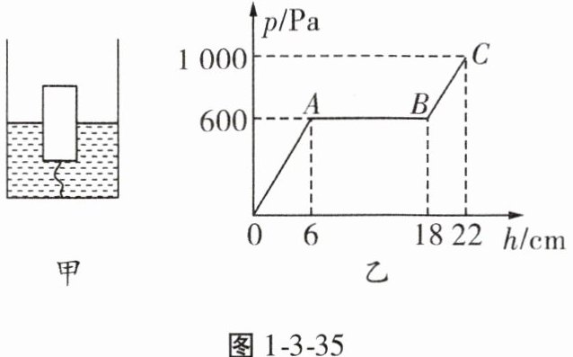 3. (2024·日照中考改编)如图1-3-35甲所示,将一底面积为0.04m²的长方体木块用细线系在一个空容器的底部,然后向容器中缓慢加水,直到木块的上表面与液面相平。木块底部受到水的压强p随容器中水的深度h的变化规律如图1-3-35乙所示。下列说法正确的是(g取10N/kg,$ρ_{水}=1.0×10^{3}kg/m^{3}$) ( )