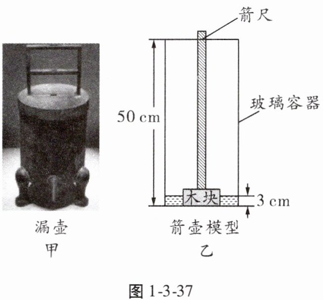 5. (2024·泰安中考)古代有一种计时器称为“漏刻”,其计时原理是通过漏壶或箭壶中水量的均匀变化来量度时间。图1-3-37甲为我国国家博物馆收藏的西汉时期的计时工具青铜漏壶,图1-3-37乙为某同学设计的计时工具箭壶模型,该模型由薄壁圆柱形玻璃容器、长方体木块(不吸水)和标有刻度的箭尺构成(箭尺重力忽略不计,其底部与木块相连)。当向容器内均匀注水,可使箭尺和木块随水面匀速竖直上升,从而计时。已知容器高为50cm、底面积为700cm²,木块重1.5N、高为5cm。初始状态下,容器内有部分水,刚好使木块在浮力作用下与容器底部脱离接触,此时水深为3cm;工作状态下,当木块上升至上表面刚好与容器上沿相平时,一个计时周期结束。(不计容器底和容器壁的厚度,g取10N/kg,$ρ_{水}=1.0×10^{3}kg/m^{3}$)