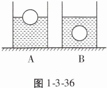 4. (2024·德州中考)如图1-3-36所示,水平桌面上有A、B两个相同的容器,分别装有密度为$ρ_{1}$、$ρ_{2}$的两种不同液体,将两个相同的小球分别放入两容器中,小球静止时,两容器液面相平,A、B两容器对桌面的压力分别为$F_{1}$、$F_{2}$,则$ρ_{1}$______$ρ_{2}$,$F_{1}$______$F_{2}$。(均选填“>”“<”或“=”)