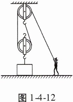 18. 工人用如图1-4-12所示装置将重为800 N的货物匀速拉至4 m高处,工人对绳子的拉力F为500 N。(不计绳重及摩擦)