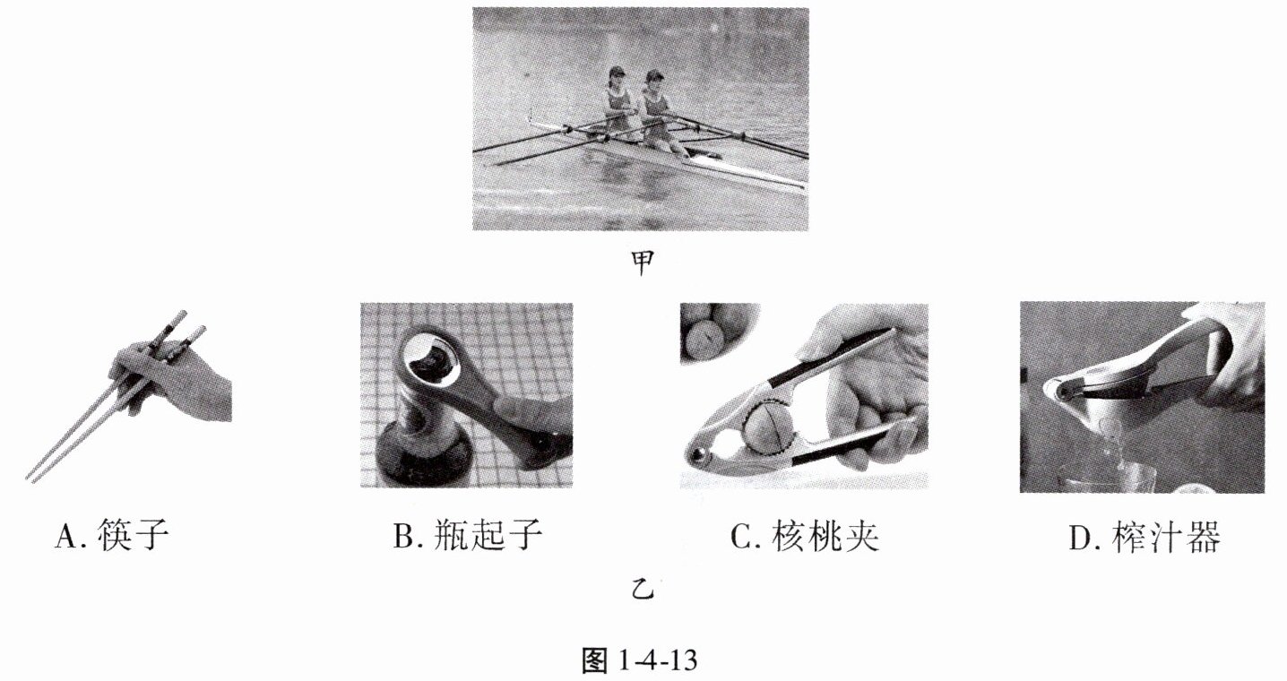 1. (2024·临沂中考)2023年9月24日,中国运动员在赛艇女子轻量级双人双桨决赛中夺冠,斩获杭州亚运会首金。如图1-4-13甲所示,赛艇的桨可视为杠杆。图1-4-13乙中所示工具正常使用时,与桨属于同类杠杆的是 ( )