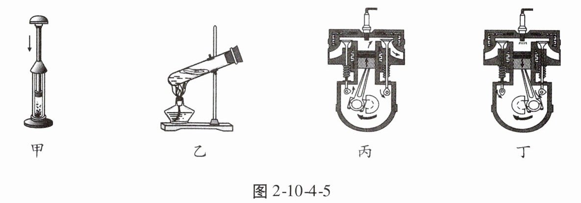 6. 如图2-10-4-5所示,甲、乙是两个演示实验的示意图,丙、丁是四冲程汽油机工作过程中的两个示意图。利用内能来做功的冲程是______图,这个冲程中燃气的内能将______(选填“增大”“减小”或“不变”);与压缩冲程原理相同的是______图演示的实验。