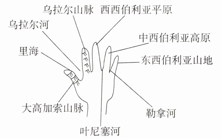 讲俄罗斯一节时,老师用右手手背给同学们形象地演示俄罗斯的地形分布,并告诉学生其手指指向北方。读图,完成1、2题。