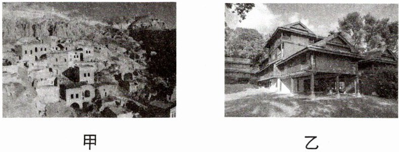 2. 根据资料,分析下面两处民居与当地自然环境的关系,并填空。