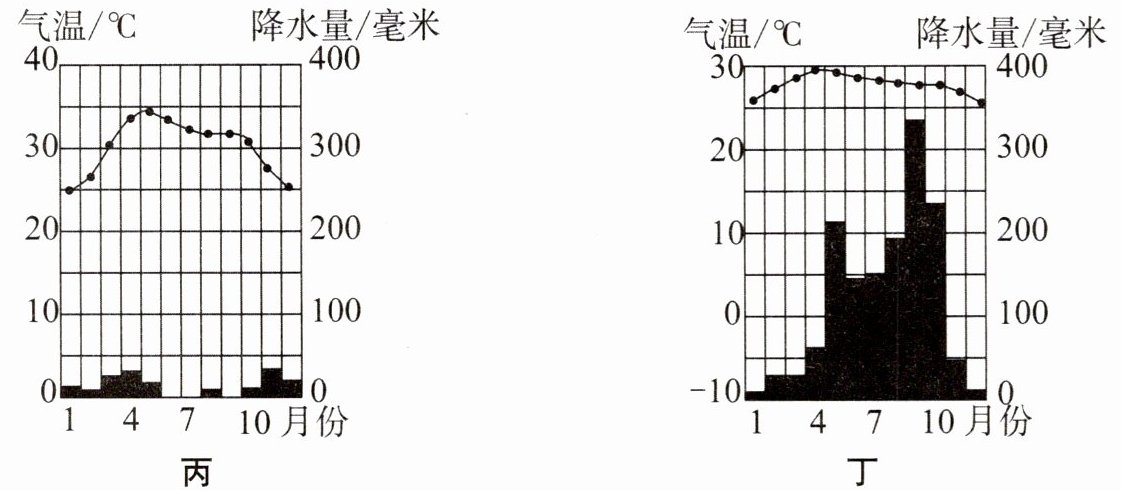 ;东南亚对应的气温曲线与降水量柱状图为丁
