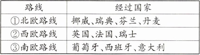 准备阶段:同学们搜集了欧洲西部自然环境和社会经济的相关资料,规划出三条旅游路线(如表所示),并从气候、景点等方面分组制作攻略。