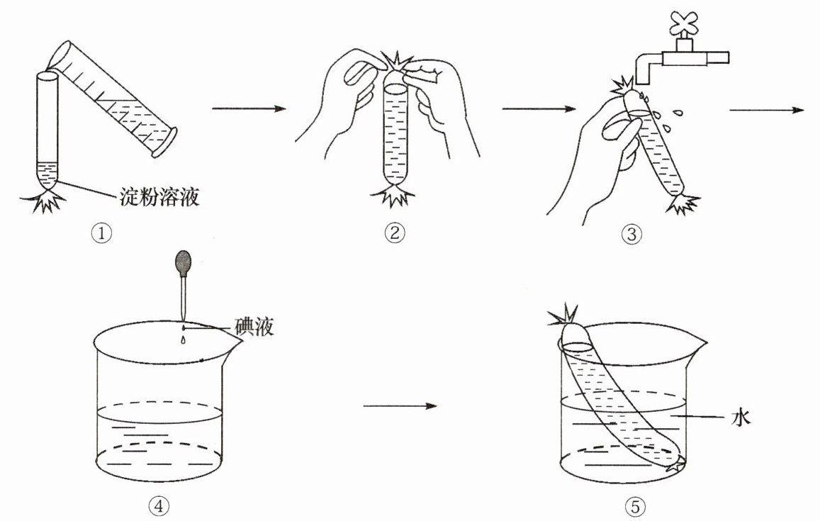 ①用线绳将透析袋的一端扎紧(如图①);注入可溶性淀粉溶液至距顶端3~5 cm处,然后用线绳将透析袋顶端扎紧(如图②);用水彻底清洗透析袋外壁(如图③);向盛有水的烧杯内加入碘液,直至溶液呈淡黄色,再将透析袋放入烧杯内(如图④⑤)。