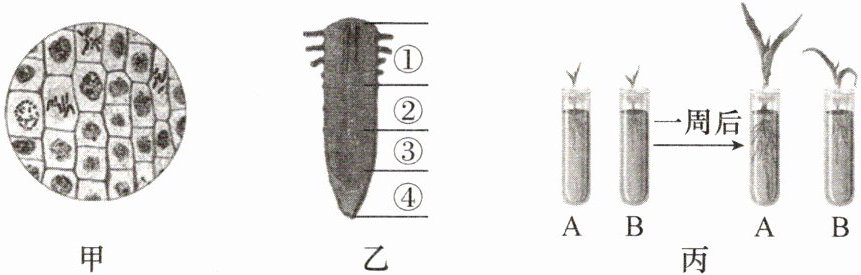 玉米原产于中美洲和南美洲,在明朝嘉靖年间传入中国,现已被广泛种植。图甲是根尖细胞分裂图,图乙是玉米根尖纵切结构图。请据图回答问题。