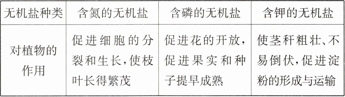 ,增大了吸收的表面积。(4)植物生长需要量最多的是含氮的、含磷的和含钾的无机盐。小秦查阅资料后总结了这三种无机盐在植物体中的作用,如下表: