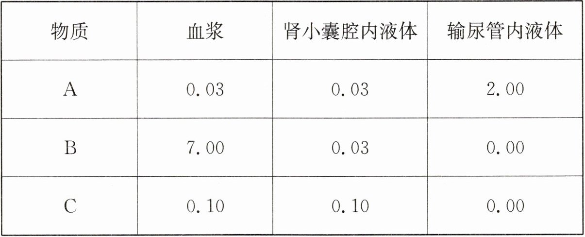 ____(填写数字)组成。(3)如表为血浆、肾小囊腔内液体和输尿管内液体中A、B、C三种物质的浓度(单位:克/100毫升)。据表中数据判断,A、B、C分别是____