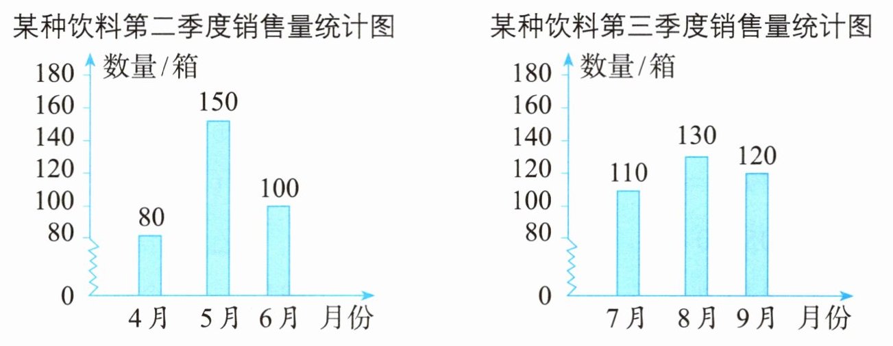$(80+150+100)÷3=110$(箱);$(110+130+120)÷3=120$(箱);$120-110=10$(箱) 第三季度的月平均销售量多,多10箱。