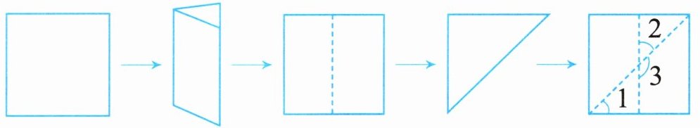 请你准备一张正方形纸,根据下图的方式动手折一折,则∠1=( )°,∠2=( )°,∠3=( )°。