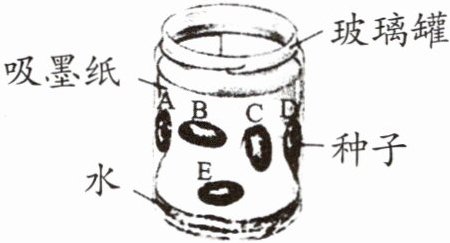 如右图,探探在研究根的生长方向,他分别把5颗一样的种子摆放在吸墨纸中,往玻璃罐中浇水使纸保持湿润。几天后种子发芽了,观察根的生长方向,发现( )。